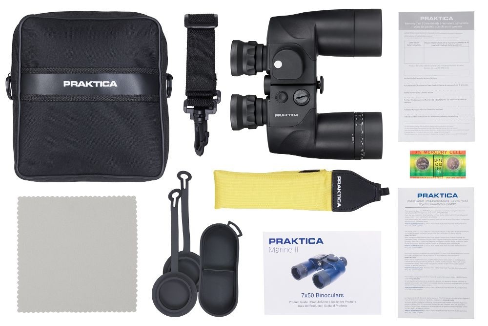 Lornetka gumowana w kolorze czarnym z kompasem i skalą odległości, wodoszczelna, wypełniona azotem, pryzmaty BAK4 powlekane typu Porro, w komplecie pasek uniemożliwiający zatonięcie lornetki, 2 baterie LR43 i futerał.