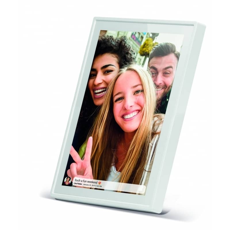 Cyfrowa ramka WiFi z wysokiej jakości ekranem dotykowym IPS z technologią Backlight, o przekątnej 25,7cm (10,1"), rozdzielczość 1280x800 pikseli (16:10), format zdjęć JPEG, BMP, GIF, PNG, obudowa akrylowa w kolorze białym, pamięć wbudowana 8GB, slot kart micro SD, gniazdo micro USB, oprogramowanie Frameo, zintegrowany sensor G, dzięki któremu zdjęcia są wyświetlane automatyczne w prawidłowym formacie (pion / poziom), możliwość zamocowania na ścianie, w komplecie zasilacz sieciowy i podpórka.